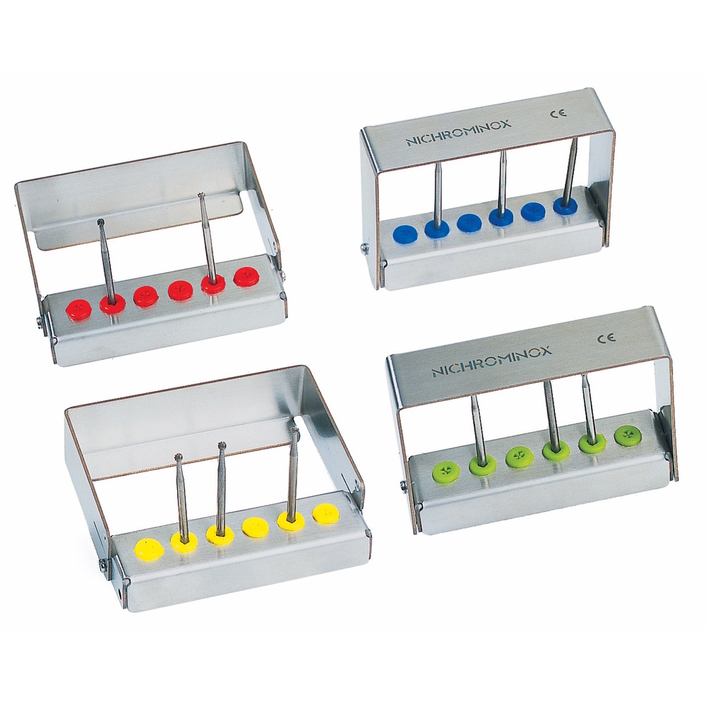 Borstander i rustfrit stål med bøjle. Anvendes til lange bor, har ekstra højde under bøjlen (5 cm) og med plads til 6 bor, med blå farvemarkeringspropper. Størrelse 7,5 x 2 x 5 cm.