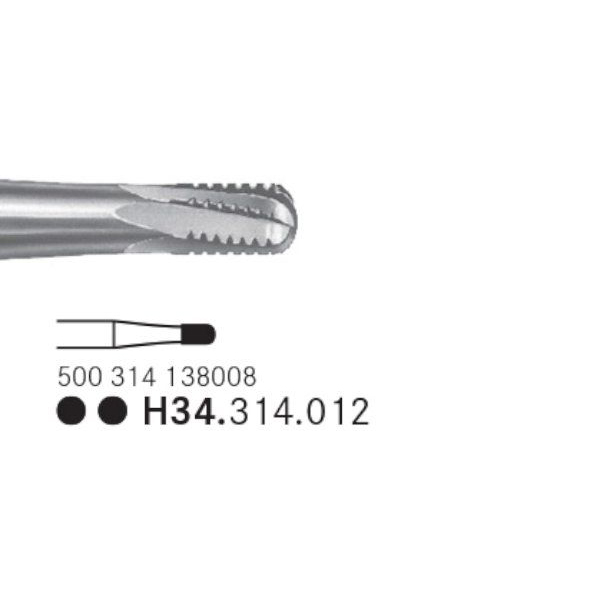 Cylinderformet hårdmetal kronefræser med snoet skær med tværhug og afrundet skærende top. Anvendes til deling af metalkroner i 45 graders vinkel. Med 2 sorte ringmarkeringer. Hovedhøjde 2 mm. H34.314.012.