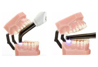 Med en ca. 60° buet lysleder skal munden åbnes meget for at polymerisere parallelt med okklusalfladen (fig. til venstre). Det er ikke noget problem med VALO-lamperne: Den lave højde og belysning i en 85°-vinkel når også tandrækker med kort afstand (fig. til højre).