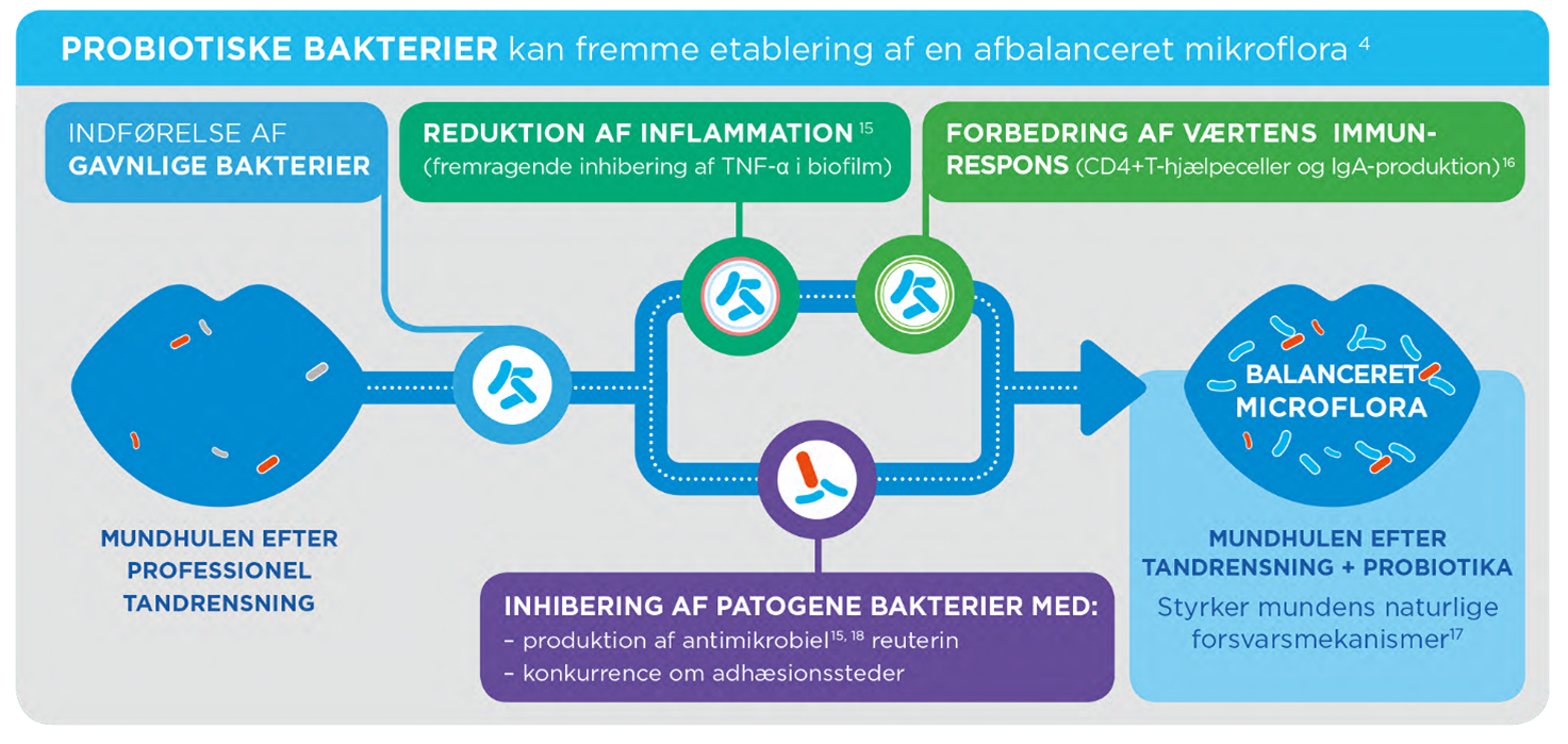 Nøje udvalgte probiotiske bakterier kan være med til at bevare fordelene ved professionel tandrensning ved at forhindre kolonisering af patogener i mundhulen, og fordi de har både antimikrobielle [15], [18] og antiinflammatoriske egenskaber.