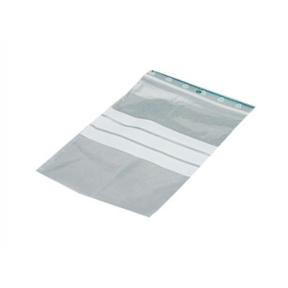 Plastposer m/lynlås, 120 x 180 mm, med skrivefelt, I LDPE plast (polyethylen med lav denstitet) som er blød og fleksibel. Tykkelse 50 my.
