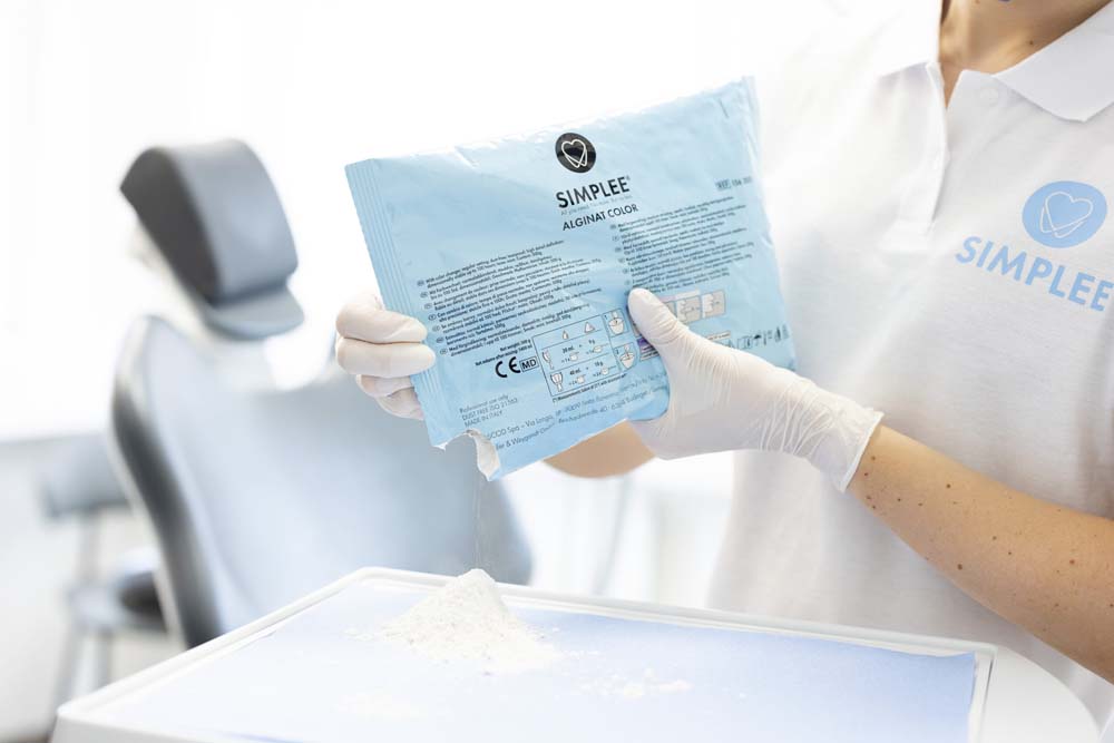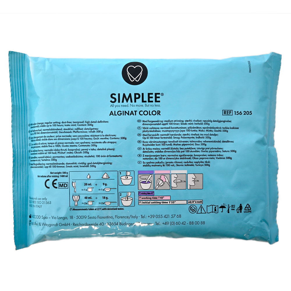 Støvfri alginat, lilla, skifter farve til pink og hvid under hærdning, med pebermyntesmag, arbejdstid 1 min. 45 sek., afbindingstid i munden 30 sek. Formstabil i op til 100 timer ved opbevaring i lufttæt emballage.