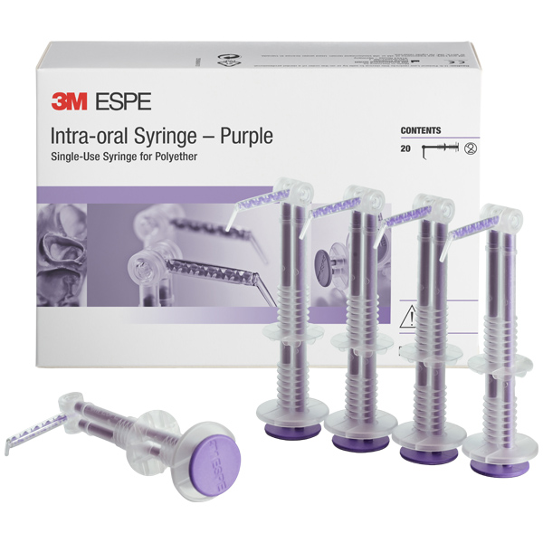 Kombineret blandespids og appliceringssprøjte til polyætermateriale fx Impregum. Materialet fyldes direkte ned i spidsen der påsættes et stempel. Ved brug (op til 12 timer senere), foldes spidsen ud og materialet blandes og appliceres direkte uden brug af magasin og aftrykssprøjte, lilla.