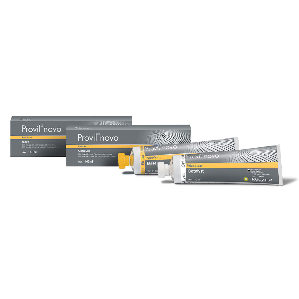 A-silikone i tuber, medium body, gul, sæt med 1 x base og katalysator, i alt 280 ml, arbejdstid 2 min, afbindingstid i munden 3 min. 30 sek.