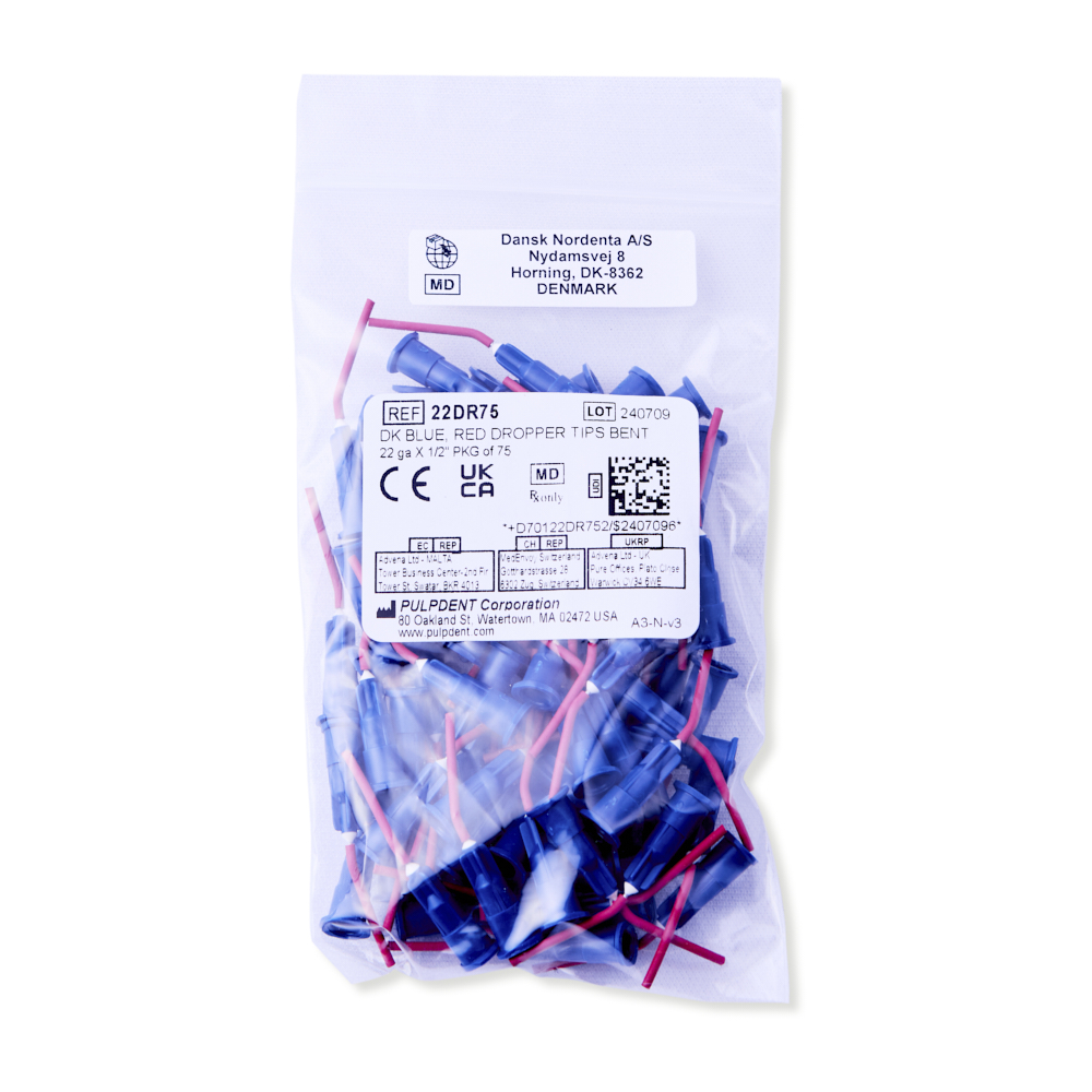 Appliceringsspidser 22G, 0,7 x 13 mm, blåt luer-lock gevind med rød, bøjet plastspids. Anvendes til Dry-Rite samt Silane Bond Enhancer.