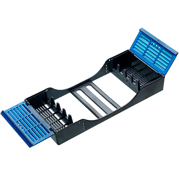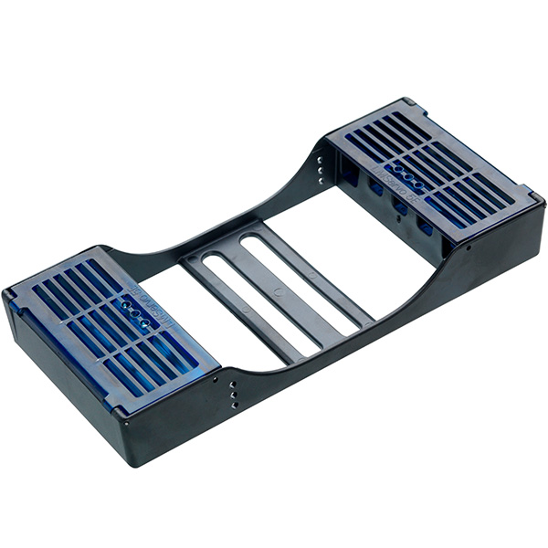 Kassette til 5 instrumenter, med holder, der fikserer instrumenterne og beskyttelsesskjold, der beskytter de arbejdende dele samt forhindrer stik uheld, 180 x 86 x 28 mm, med blå skjold.