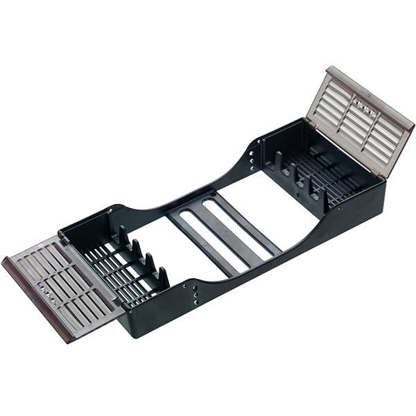 Kassette til 5 instrumenter, med holder, der fikserer instrumenterne og beskyttelsesskjold, der beskytter de arbejdende dele samt forhindrer stik uheld, 180 x 86 x 28 mm, med grå skjold.
