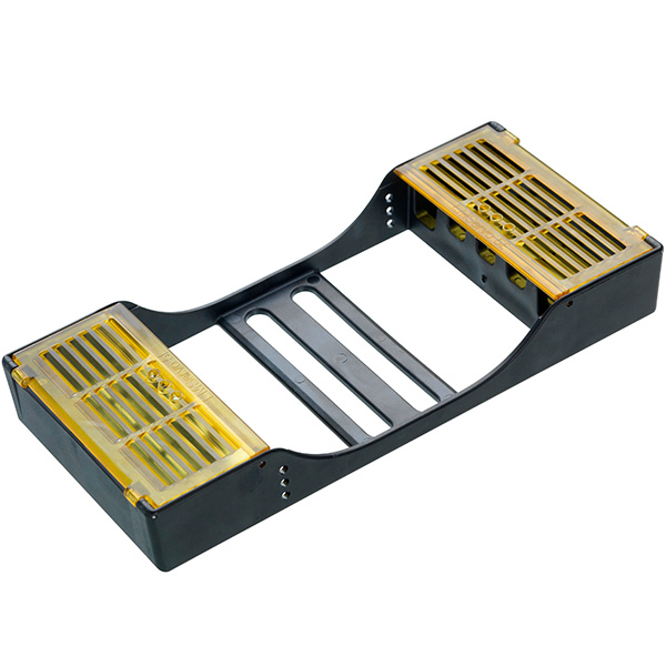 Kassette til 5 instrumenter, med holder, der fikserer instrumenterne og beskyttelsesskjold, der beskytter de arbejdende dele samt forhindrer stik uheld, 180 x 86 x 28 mm, med gule skjold.