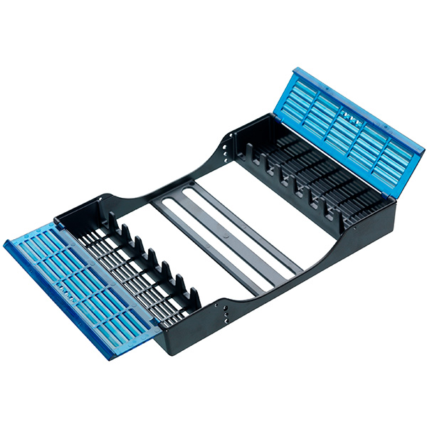Kassette til 8 instrumenter, med holder, der fikserer instrumenterne og beskyttelsesskjold, der beskytter de arbejdende dele samt forhindrer stik uheld, 180 x 136 x 28 mm, med blå skjold.