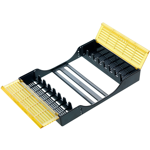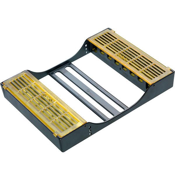 Kassette til 8 instrumenter, med holder, der fikserer instrumenterne og beskyttelsesskjold, der beskytter de arbejdende dele samt forhindrer stik uheld, 180 x 136 x 28 mm, med gule skjold.