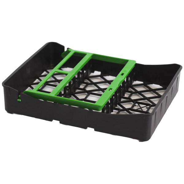Til Practipal bakkesystem, bakke i ½ størrelse med plads til 9 instrumenter, med bøjle, der holder instrumenterne fast, grøn. Autoklavepose varenr. 13458 passer til en ½bakke, autoklavepose nr. 28219, passer til to ½bakker. Clips til samling af bak- kerne kan bestilles på varenr. 627.