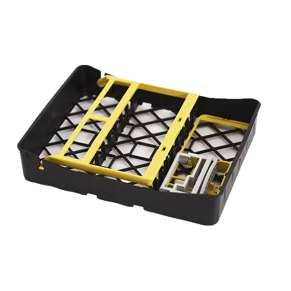 Til Practipal bakkesystem, bakke i ½ størrelse med plads til 9 instrumenter, grå, med bøjle, der holder instrumenterne fast, gul, samt borholder med adapter, med plads til 2 forlængede bor, 5 HP/RA bor og 8 FG bor, gul.