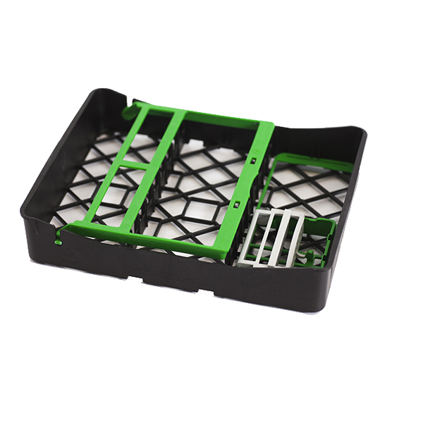 Til Practipal bakkesystem, bakke i ½ str. med plads til 9 instr., grå, med bøjle, der holder instrumenterne fast, grøn, samt filholder med adapter, med rodmål og plads til 13 file, grøn.