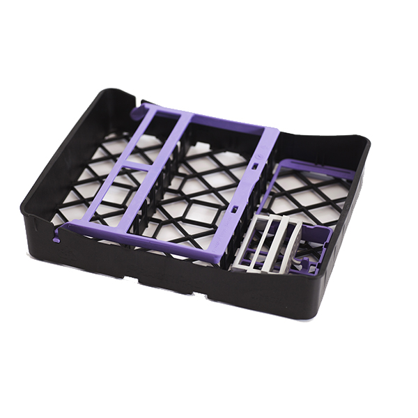 Til Practipal bakkesystem, bakke i ½ str. med plads til 9 instr., grå, med bøjle, der holder instrumenterne fast, lilla, samt filholder med adapter, med rodmål og plads til 13 file, lilla.