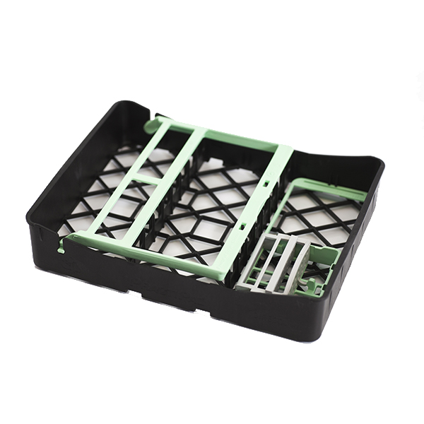 Til Practipal bakkesystem, bakke i ½ str. med plads til 9 instr., grå, med bøjle, der holder instrumenterne fast, mintgrøn, samt filholder med adapter, med rodmål og plads til 13 file, mintgrøn.