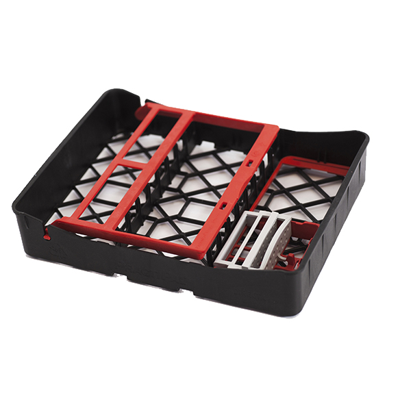 Til Practipal bakkesystem, bakke i ½ str. med plads til 9 instr., grå, med bøjle, der holder instrumenterne fast, rød, samt filholder med adapter, med rodmål og plads til 13 file, rød.