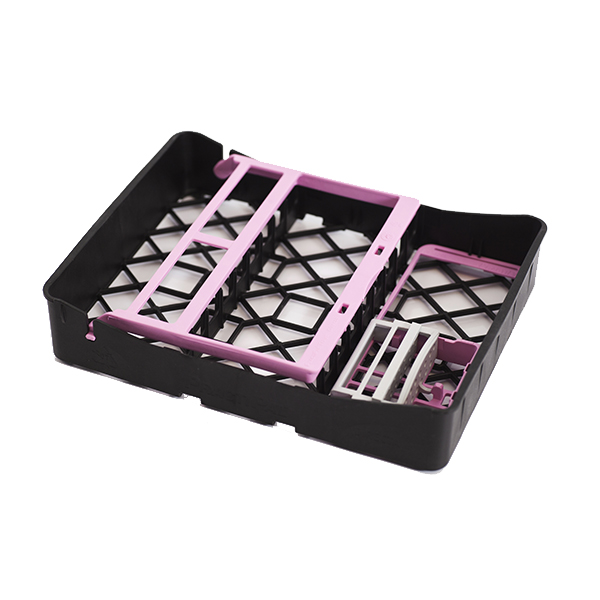 Til Practipal bakkesystem, bakke i ½ str. med plads til 9 instr., grå, med bøjle, der holder instrumenterne fast, rosa, samt filholder med adapter, med rodmål og plads til 13 file, rosa.
