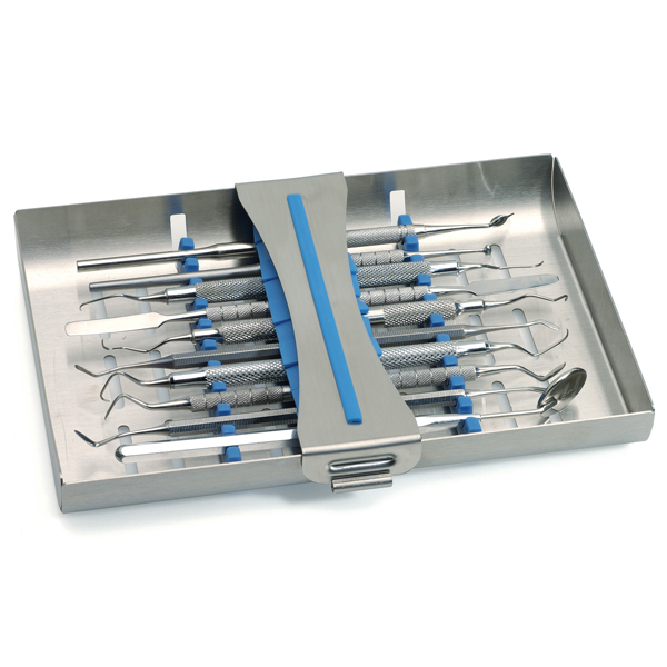 Perforeret bakke i rustfrit stål, 18,4 x 15 x 2,5 cm, med instrumentholder i blå silikone med plads til 10 instrumenter.