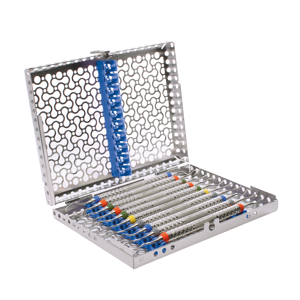 hele behandlingscyklussen, mål 152 x 184 x 34 mm, med blå markering. Kasette, IME12DIN18 med plads til 10 instrumenter, i langtidsholbart rustfrit stål, der kræver lav vedligeholdelse og hulmønstret design, der giver 30% flere åbninger, med bløde, farvede silikoneskinner, der holder instrumenterne sikkert fast under