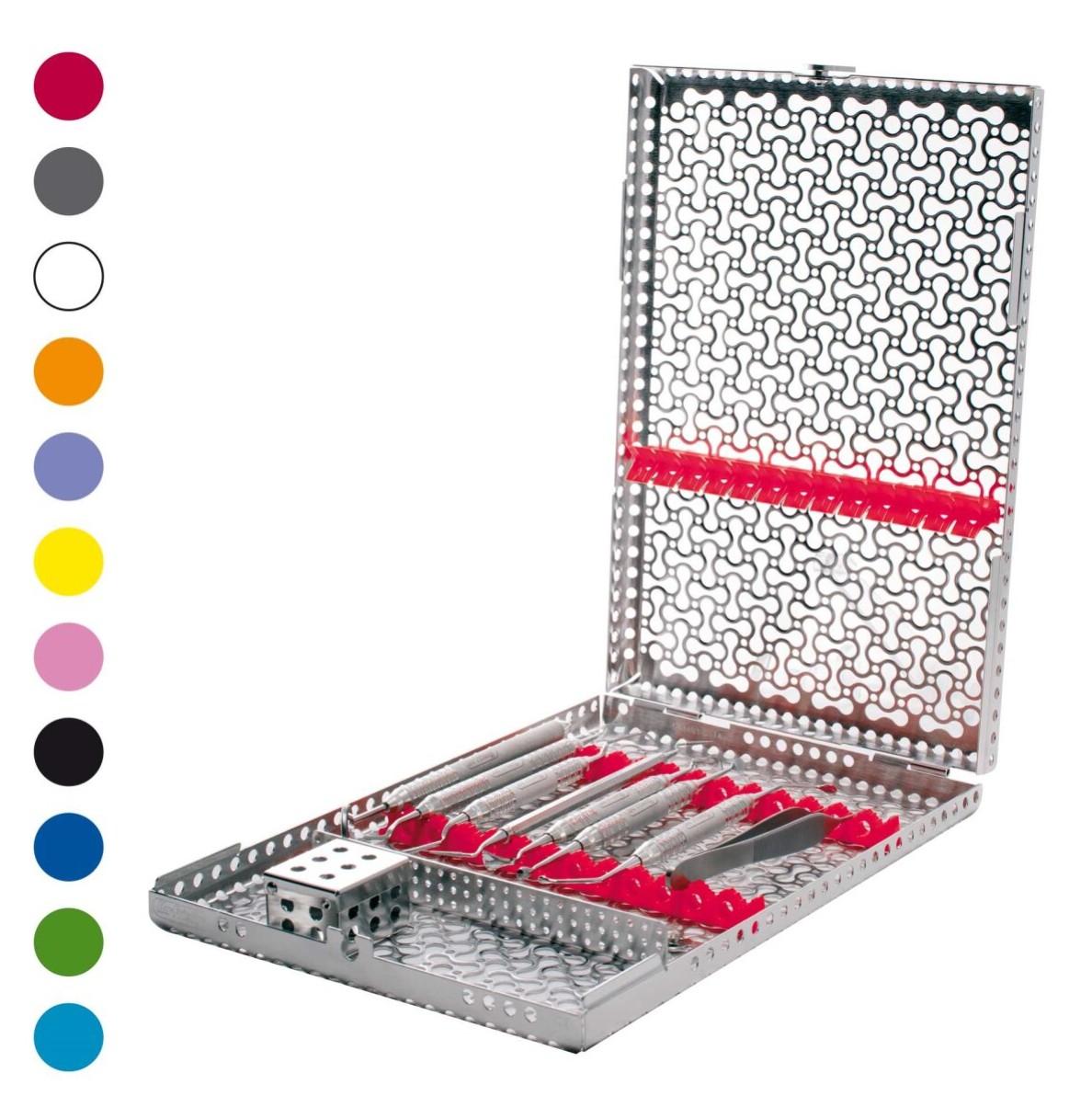 Kasette, IMEDIN130 med plads til 13 instrumenter, i langtidsholbart rustfrit stål, der kræver lav vedligeholdelse og hulmønstret design, der giver 30% flere åbninger, med bløde, farvede silikoneskinner, der holder instrumenterne sikkert fast under hele behandlingscyklussen, mål 290 x 184 x 34 mm, med rød markering.