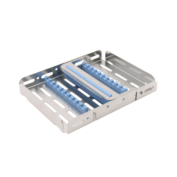 Perforeret bakke i rustfrit stål, 18 x 14 x 3 cm, med instrumentholder i silikone med plads til 10 instrumenter i blå.