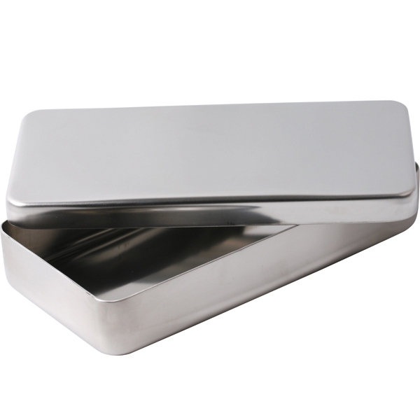 Kassette i rustfrit stål, bund og låg, 18 x 9 x 3 cm.