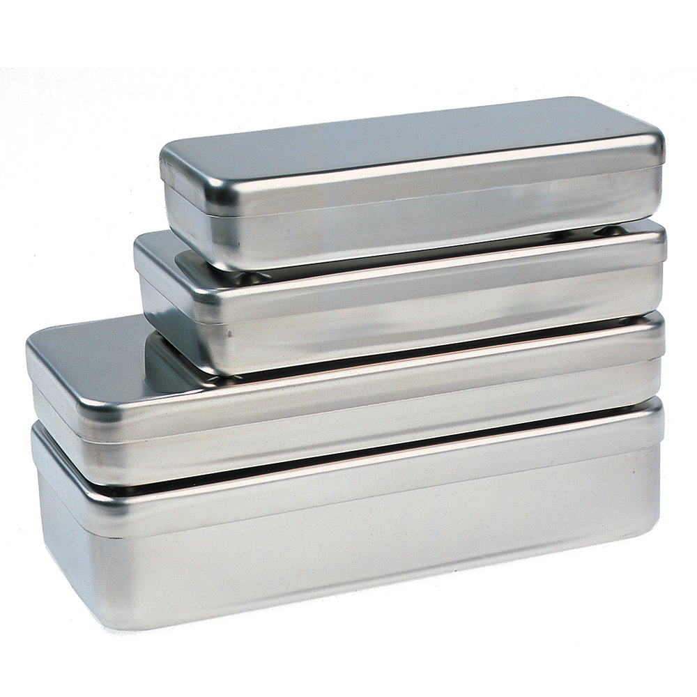 Kassette med låg til gaze tamponer, operationssæt, rodbehandlingssæt, tænger etc., rustfrti stål, grå, 21 x 10 x 3 cm.