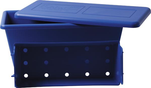 Cidex kar, blå med perforeret indsats. Højde 13,5 cm, måler 27 x 10,5 cm i bunden og 31 x 14 cm hvor låget sidder på.