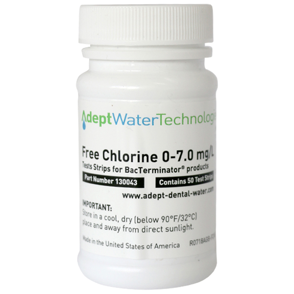 Klorteststrips til brug ved kontrol af vandbehandlings anlæg på klinikker, hvor anlægget er indbygget i unitten, måler indholdet af klor i vandet i intervallet 0,0 til 1,6 ppm. Procedure: Efter den daglige gennemskylning af unit, aftappes der 1 kop vand fra kopfylderen. Teststrippen bevæges forsigtigt frem og tilbage i 30 sekunder, det overskydende vand rystes af testrippen, buk teststrippen på midten så der kommer hvid plastik på bagsiden af indikatorfeltet. Sammenlignes med farven på embal- lagens farveskala.