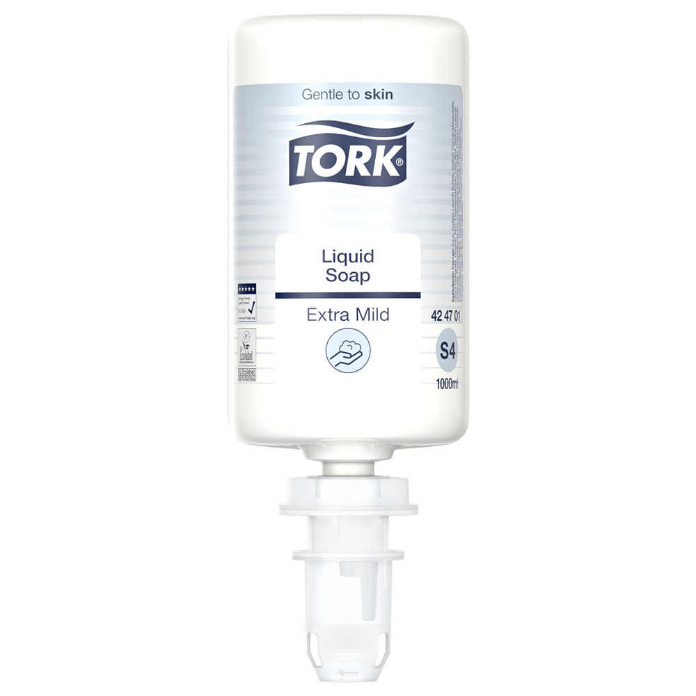Antimikrobiel flydende sæbe, dræber bakterier og vira uden at hænderne udtørrer. Indeholder ikke parfume og farvestoffer, overholder den europæiske hygiejnestandard EN1500. i sammenklappelig 1 l flaske, der bliver flad i takt med at den tømmes. Til Tork S4 dispenser 561500 (varenr. 11271). Engangsflasken mindsker risikoen for overførsel af bakterier og andre mikroorganismer. Tork nr. 424710.