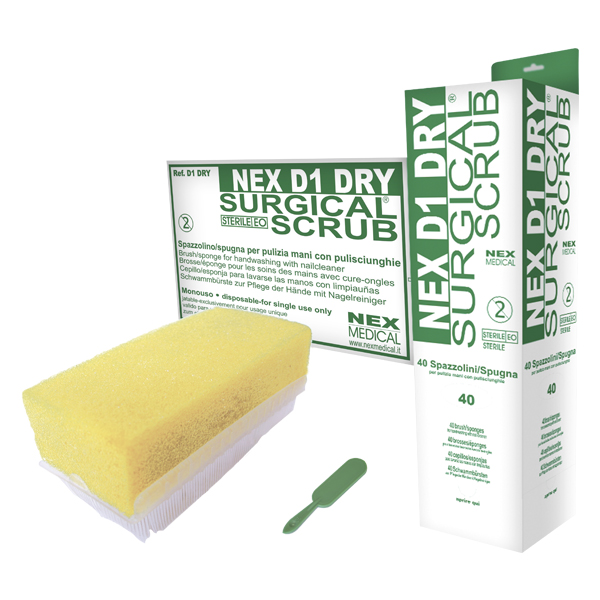 Neglebørste/svamp og neglerenser, Nex D1 Dry Surgical Scrub, til kirurgisk håndvask, sterilt enkeltpakkede. OBS: er uimprægneret, så brug en sæbe efter eget valg.