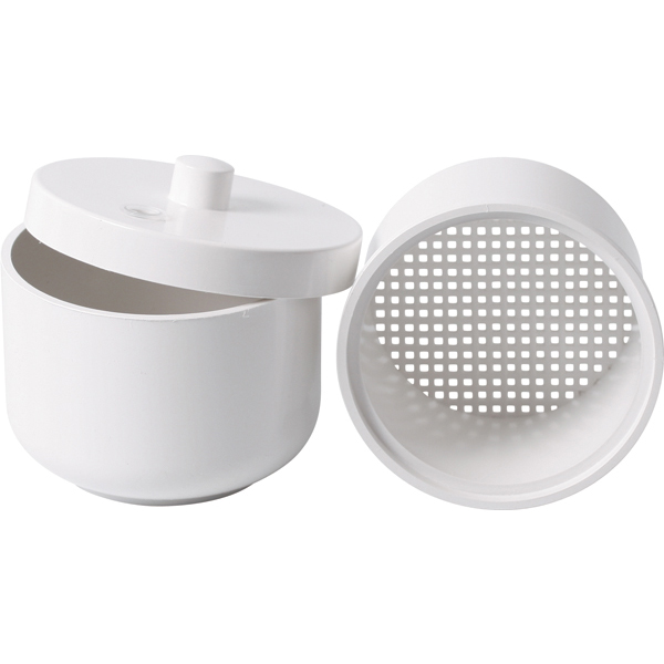 Borbeholder med låg i hvid plast, med siindsats, autoklaverbar.