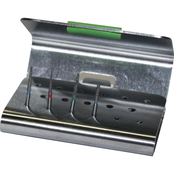 Borstander med clip-låg, så borerne holdes fast i fx opvaskemaskine, ultralyd og autoklave, til 12 FG og 5 RA bor, 4 omskiftelige silicone-indikatorer medfølger i farverne rød, blå, gul og grøn. Størrelse 6 x 4,5 x 2,8 cm.