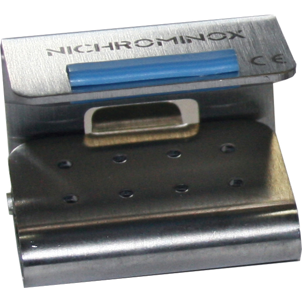 Borstander med clip-låg, så borerne holdes fast i fx opvaskemaskine, ultralyd og autoklave, til 8 FG bor, 4 omskiftelige silicone-indikatorer medfølger i farverne rød, blå, gul og grøn. Størrelse 3,5 x 2,8 x 2,8 cm.