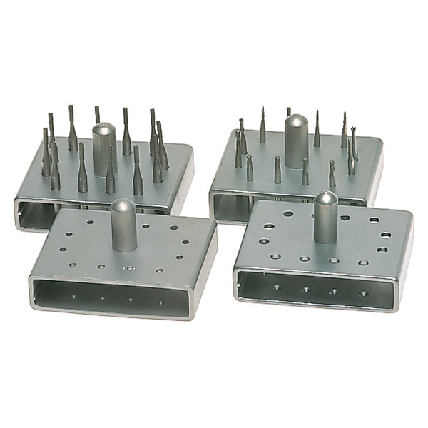 Borstander i rustfrit stål til 12 FG bor, 4 x 3 x 2,3 cm. Kan rengøres i dentalopvaskemaskine.