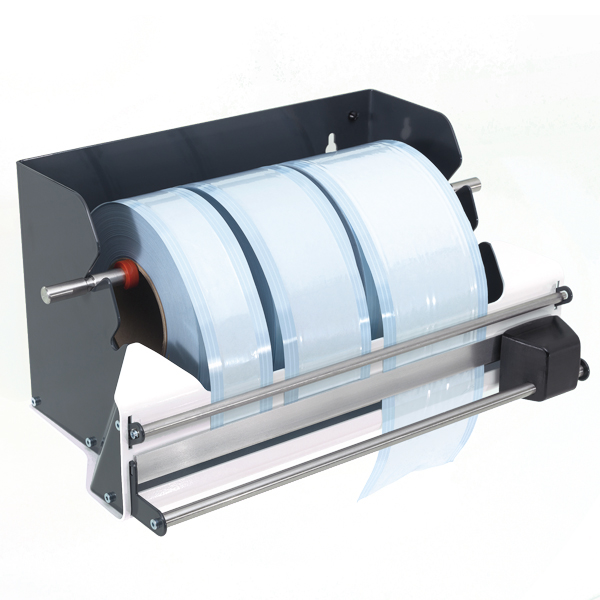 Multi-funktionel rulleholder med skære-enhed til indpakning ved sterilisering, monteres på væg eller placeres på bord, kan kombineres med Hygopac Plus, mål 24 x 39,5 x 19,5 cm.