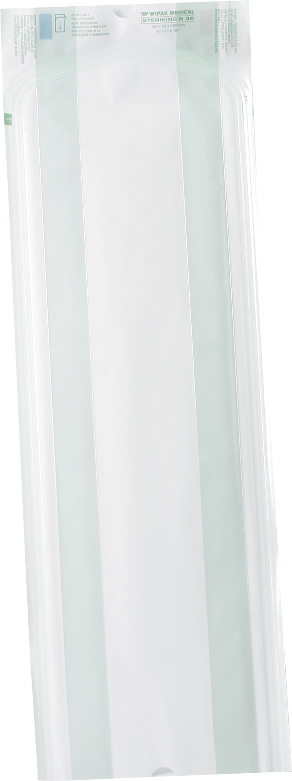 Papir/plast til autoklavering, dampgennemtrængeligt, bakterietæt papir med indikator på den ene side og plast på den anden, med fold, 15 x 5 x 46 cm, indermål 12,5 x 5 x 40,5 cm, grøn. Med 3-delt svejsesøm.