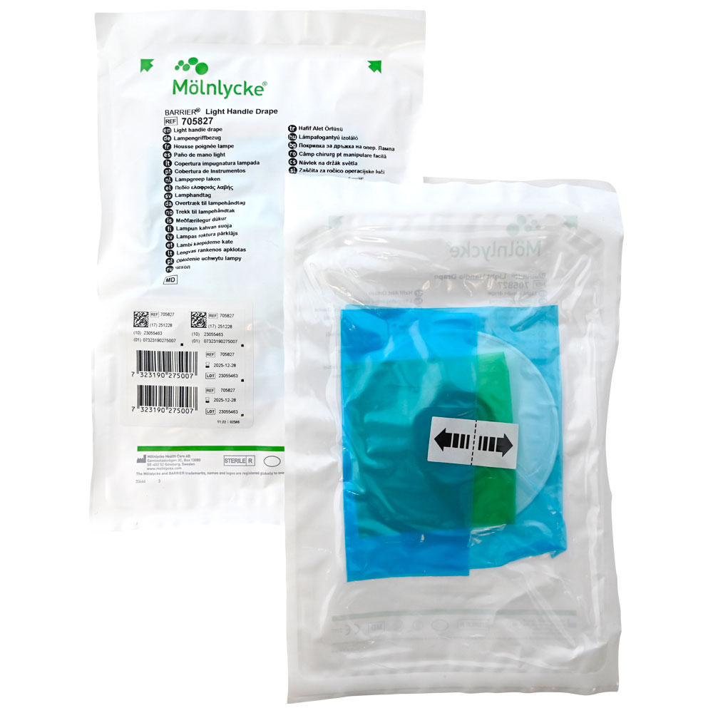 Steril universal plastskive med påmonteret plastpose til afdækning af lampehåndtag på unitlampe, Ø 4,5 x 15 cm, enkeltpakket.