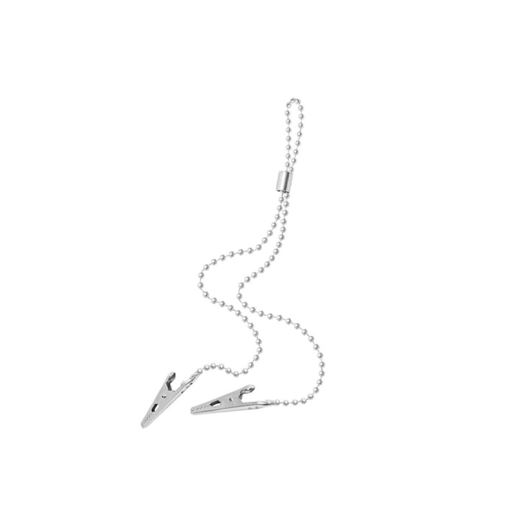 Servietholder, kuglekæde af metal med spidst krokodillenæb og metal rør som lås til at stramme kæden/justere længden. Længde 35 cm. Kan autoklaveres.
