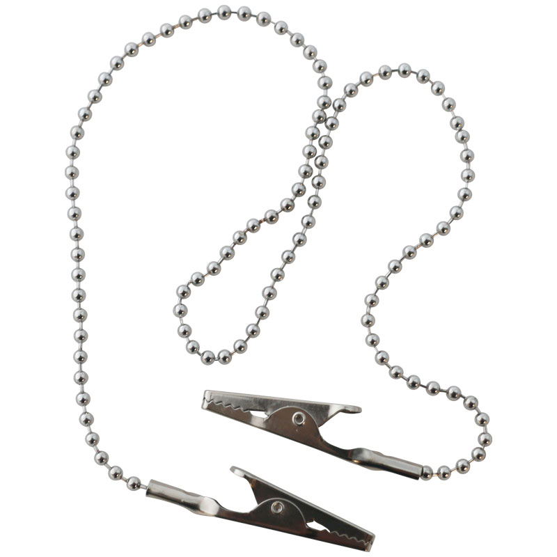 Servietholder, kuglekæde af rustfrit stål med plastik rør som lås til at stramme kæden/justere længden og krokodillenæb. Længde 56 cm. Tåler IKKE autoklavering, kun overfladedesinfektion.