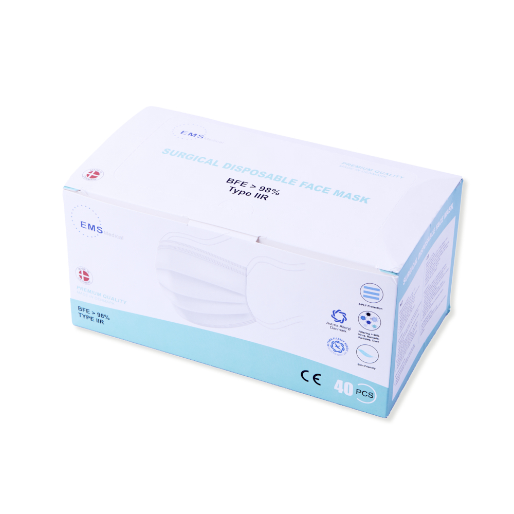 Dansk producerede medicinske mundbind med bindebånd og næseklemme, 3-lags. Opfylder standard EN 14683 type IIR, med en bakteriefiltreringsevne (BFE) på over 99%. Allergivenlige - godkendt og anbefalet af Astma-Allergi Danmark. Lugt- og latexfri.