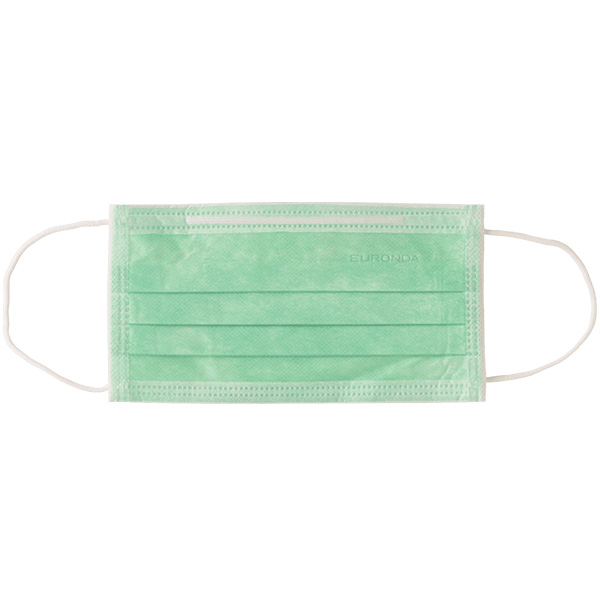 3-lags mundbind, klasse II, med næseklemme og øreelastik, latexfri, grøn. Indeholder IKKE phthalater eller formaldehyd.
