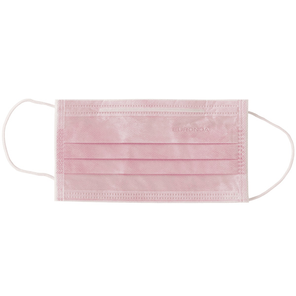 3-lags mundbind, klasse II, med næseklemme og øreelastik, latexfri, rosa. Indeholder IKKE phthalater eller formaldehyd.