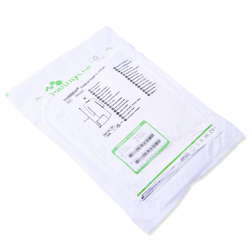 Barrier operationskittel, Classic SP (Standard Performance) med bløde, elastiske manchetter og bindebånd i halsen, overlappende (steril) ryg, sterilt pakket med 2 håndklæder, str. M, længde 121 cm, omkreds 135 cm. FSC-mærket.