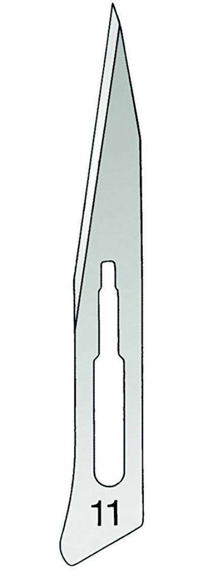 Skalpelblade, nr. 11, lancetformet-lige, sterile. Fremstillet af kulstofstål (karbonstål), hvilket sikrer skarphed og holdbarhed. Steriliseret ved gammastråling og individuelt pakket i peelpacks af aluminiumfolie med VCI-papir, hvilket sikrer lang holdbarhed og nem håndtering. Passer til skalpelgreb nr. 3
