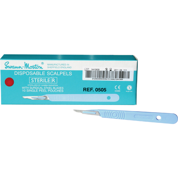 Skalpeller, blå plastskafter med rustfri blade, nr. 15, bådformet, sterile.