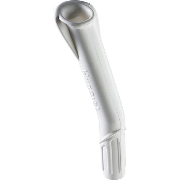 Vinkelbøjet forlængertip i hvid plast til Hygovac sug, med tragtformet åbning, autoklaverbar.