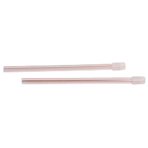 Spytsug til tynde sugeslanger i blød plast med bøjelig ståltråd og aftagelige hætter, klare. Længde u/hætte 12 cm m/hætte 12,7 cm.