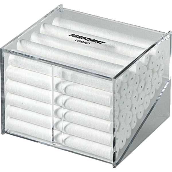 Klar plexiglasbeholder til Parotisruller, med låg der automatisk falder i efter udtagelse af en parotisrulle, 11 x 10,5 x 7 cm.