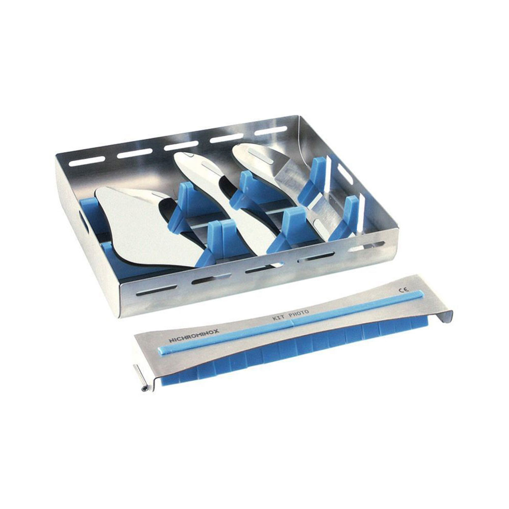Kassette med 3 fotospejle. Kassetten er 19,8 x 16,5 x 3,7 cm og med afrundede kanter. Med "Lock System", selvlåsende og aftagelig stål- og silikoneholder, som holder spejlene på plads med et enkelt klik. Med silikone-indsatse, der er formet til at holde sikkert på spejle og håndtag. Indeholder følgende fotospejle: Large Palatal (190760) 10 x 6,9/6,1 cm, Lateral C (190762) 15 x 3,8 cm og Lingual P (190764) 15 x 5,5/3,5 cm. Spejlene er Chromium-belagt på begge sider, tykkelse 3 mm, ingen dobbelt-effekt, glasset er fladt uden forvridning, vendbare selv for asymetriske vinkler. Alt tåler autoklavering.